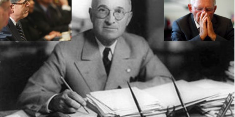 Προφανώς ο κ.Σόϊμπλε γνωρίζει ιστορία. Και κάτι θα έχει ακούσει για το Δόγμα Τρούμαν το 1947. Μόλις λίγα χρόνια πριν όλες οι “καμμένες” από την Γερμανία χώρες -και η Ελλάδα πρώτη απ΄ αυτές- είχαν αποφασίσει γενναία να “σβήσουν” τα χρωστούμενα της χώρας του,προκειμένου αυτή να βαδίσει στο δρόμο της “ανάπτυξης” που είχε όπως φάνηκε τερματικό σταθμό την πρωτοκαθεδρία στην Ευρώπη.