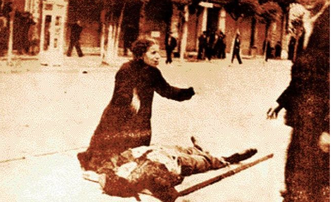 Στην παραπάνω φωτογραφία ο Τάσος Τούσης από το Ασβεστοχώρι κείτεται νεκρός στη συμβολή των οδών Εγνατίας και Βενιζέλου. Η μάνα του ολοφύρεται.