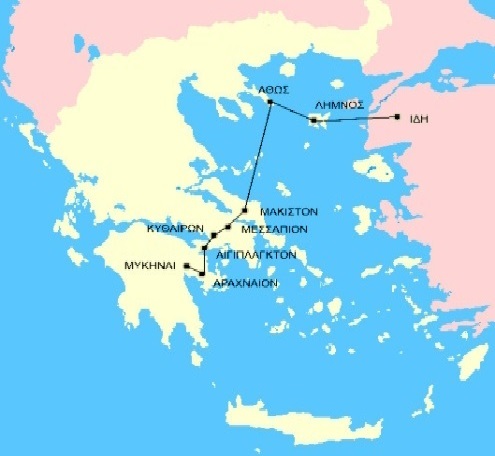 Στην Ιλιάδα αναφέρεται ότι, με αυτό το σύστημα ο Αγαμέμνων ανήγγειλε μέσα σε μια νύχτα την άλωση της Τροίας (1184 π.Χ.) στη σύζυγό του Κλυταιμνήστρα, που βρισκόταν στις Μυκήνες. Η μετάδοση του μηνύματος επιτεύχθηκε με τις φωτιές που άναβαν σκοποί εγκατεστημένοι ειδικά για αυτό το λόγο στις κορυφές Ίλιον-Ακρωτήριο Άρμαιο (Λήμνου)-Όρος Άθως-Μάκιστον (Δίρφυς)-Μεσσάλιο (Χτυπάς)-Κιθαιρών-Αιγίπλακτον (Πατέρας)-Αραχναίο-Μυκήνες, καλύπτοντας μια απόσταση περίπου 800 χλμ.