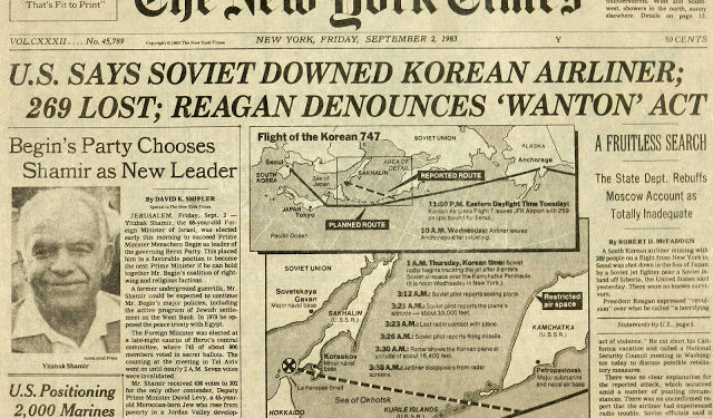 1983: Στην πτήση 007 των κορεατικών αερογραμμών επιβαίνει και Αμερικανός γερουσιαστής. Το αεροσκάφος καταρρίφθηκε από μαχητικό αεροσκάφος της Σοβιετικής Ένωσης στη Θάλασσα της Ιαπωνίας. Ο τότε Αμερικανός πρόεδρος Ρόναλντ Ρέιγκαν κάνει λόγο για “τρομοκρατική επίθεση”. Σκοτώθηκαν και οι 269 επιβαίνοντες. Οι Σοβιετικοί υποστήριξαν ότι υποπτεύονταν πως επρόκειτο για αμερικανικό κατασκοπευτικό αεροσκάφος.
