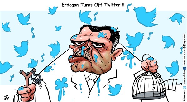 Η επίθεση του Ερντογάν εναντίον του Twitter, γράφει η Laure Marchand στη Φιγκαρό, είχε ως αποτέλεσμα να χαθούν και τα τελευταία αποθέματα αξιοπιστίας που έμεναν γι’αυτόν στη διεθνή σκηνή. Στην Τουρκία, οι αντίπαλοί του ανταγωνίζονται ποιος θα τον γελοιοποιήσει περισσότερο. Ένα σκίτσο που δείχνει τον πρωθυπουργό καλυμμένο με κουτσουλιές από γαλάζια πουλάκια (παραπάνω), το σύμβολο του Twitter, είχε μεγάλη επιτυχία. Ακόμη και ο πρόεδρος Γκιουλ τον αποδοκίμασε, γράφοντας στον λογαριασμό του ότι «το κλείσιμο των μέσων κοινωνικής δικτύωσης δεν μπορεί να γίνει αποδεκτό».