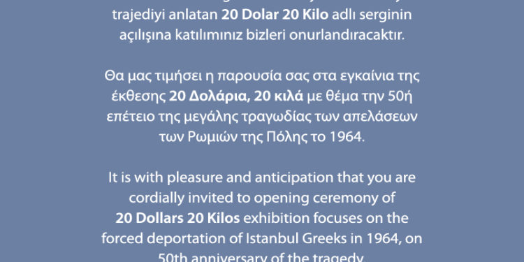 «20 δολάρια, 20 κιλά» : Με αυτόν τον τίτλο, από το βάρος που επετράπη στους απελαθέντες Ελληνες κατοίκους της Κωνσταντινούπολης, να έχουν μαζί τους την ώρα που διέσχιζαν τα σύνορα, διωγμένοι από τον τόπο τους,  διοργανώνεται έκθεση με αφορμή τη συμπλήρωση πενήντα χρόνων από τον ξεριζωμό του 1964.