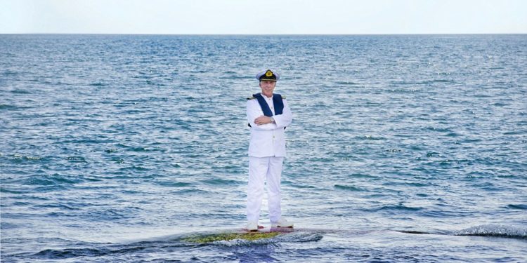 Ο καπετάνιος Τζέιμς Οσπερυ στάθηκε στη βολβοειδή πλώρη του πλοίου, που προεξέχει από το μπροστινό μέρος του, για να ποζάρει μπρόστα απο τον φωτογραφικό φακό με αφορμή την δέκατη επέτειο του υπερωκεάνιου, το οποίο βρίσκεται αγκυροβολημένο στα ανοικτά του Μπαλί.