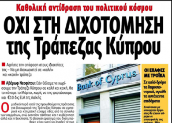 Read moreΗ απόφαση για το ποσοστό του τελικού κουρέματος των ανασφάλιστων καταθέσεων της Τράπεζας Κύπρου ειναι στα περισσότερα πρωτοσέλιδα.