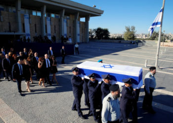 Read moreΜέλη των ενόπλων δυνάμεων μετέφεραν το φέρετρο που είναι καλυμμένο με την ισραηλινή σημαία στο χώρο της τελετής.