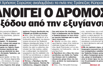 Read moreOι εξελίξεις σε ό,τι αφορά την έξοδο της Τράπεζας Κύπρου από τo καθεστώς εξυγίανσης ειναι στα σημερινά πρωτοσέλιδα