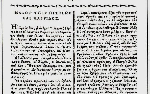 Εις τας παρούσας περιστάσεις της Ελλάδος, ότε το ελληνικόν γένος, μη υπομένον τον βαρύν της τυραννίας ζυγόν, τον οποίον έφερεν αναξίως αιώνας ολοκλήρους, απεφάσισεν υπό την προστασία της Θείας Προνοίας, να πιάση τα όπλα, διά να αναλάβη την οποίαν απώλεσεν αυτονομίαν, είναι αναγκαιοτάτη εφημερίς εις την Ελλάδα εκδιδομένη.