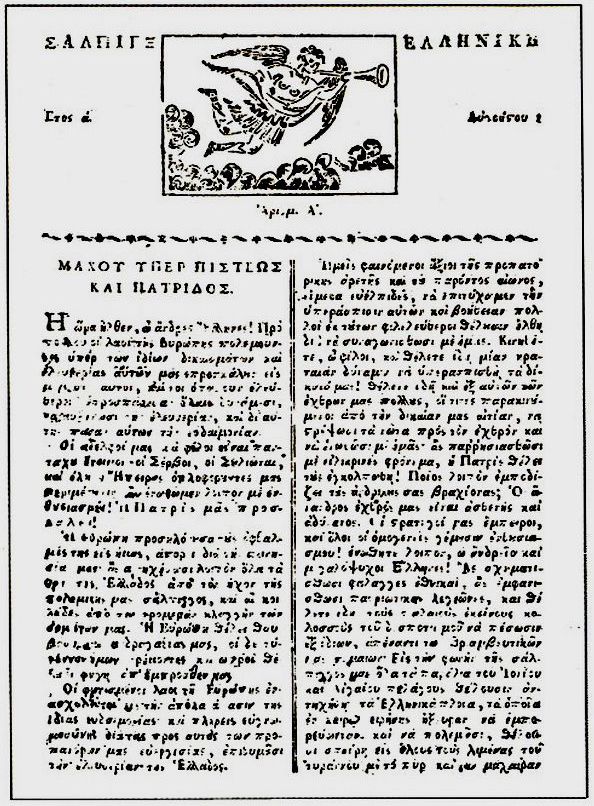 Εις τας παρούσας περιστάσεις της Ελλάδος, ότε το ελληνικόν γένος, μη υπομένον τον βαρύν της τυραννίας ζυγόν, τον οποίον έφερεν αναξίως αιώνας ολοκλήρους, απεφάσισεν υπό την προστασία της Θείας Προνοίας, να πιάση τα όπλα, διά να αναλάβη την οποίαν απώλεσεν αυτονομίαν, είναι αναγκαιοτάτη εφημερίς εις την Ελλάδα εκδιδομένη.