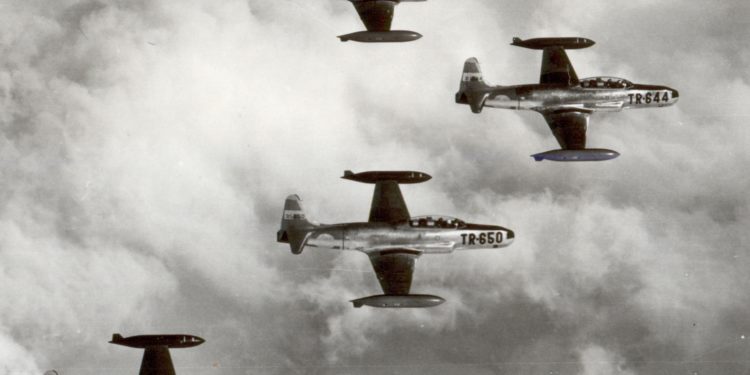Η πρώτη δοκιμαστική πτήση έγινε στις 10 Σεπτεμβρίου 1953 με τον Υπσγό (Ι) Αλέξ. Παπανικολάου στα χειριστήρια του α/φους με κωδικό «FS-052» ενώ η πρώτη επιχειρησιακή αποστολή πραγματοποιήθηκε στις 24 του μηνός, πάλι από τον Διοικητή του Σμήνους. Τον Μάιο του ’55, το 348ο Σμήνος Αναγνωρίσεως αναβαθμίζεται σε Μοίρα και εξοπλίζεται με Lockheed RT-33Α, τα πρώτα αληθινά αναγνωριστικά τζετ της Π.Α.