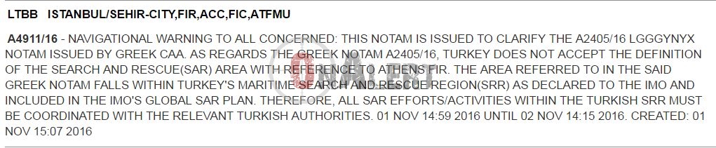 Όμως ο Τούρκος ειδοποίησε το τουρκικό κέντρο έρευνας και διάσωσης να τον σώσει κι έτσι στις 17:01 (τοπική ώρα) εξέδωσε και η Τουρκία δική της ΝΟΤΑΜ ορίζοντας περιοχή έρευνας και διάσωσης μέσα στο Αιγαίο.