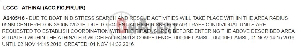 Η Ελλάδα στις 16:15 (τοπική ώρα) εξέδωσε άμεσα ΝΟΤΑΜ και όρισε την περιοχή έρευνας και διάσωσης, προκειμένου να προσφέρει κάθε δυνατή βοήθεια στον ναυαγό, όπως ορίζουν οι διεθνείς συνθήκες και όπως απορρέει από τις υποχρεώσεις της για την έρευνα και διάσωση στην περιοχή που βρίσκεται μέσα στο FIR Αθηνών.