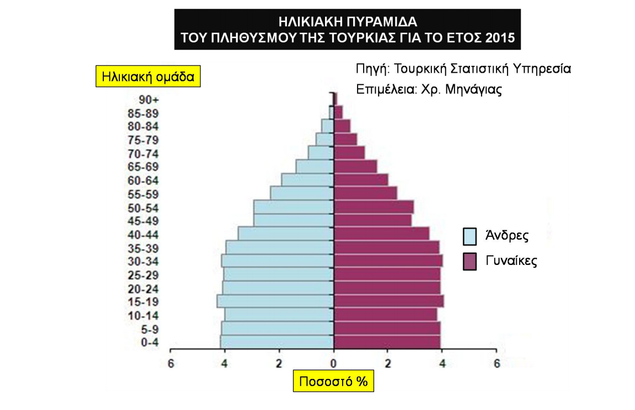 Την ακτινογραφία της Τουρκίας, κάνει ο αναλυτής Χρήστος Μηνάγιας αξιποιώντας τα τελευταία στοιχεία που δημοσίευσε η Τουρκική Στρατιστική Υπηρεσία. Πέραν των βασικών στοιχείων για την ραγδαία αύξηση του πληθυσμού, ο οποίος στα ποιοτικά του χαρακτηριστικά παραμένει νέος (το 24% είναι παιδιά 0-14 ετών ενώ στην Ελλάδα αυτό το ποσοστό είναι κάτω από 10%) ο αναλυτής εντοπίζει τα βασικά χαρακτηριστικά της τουρκικής κοινωνίας, η οποία παρουσιάζει δημογραφική ανισορροπία.