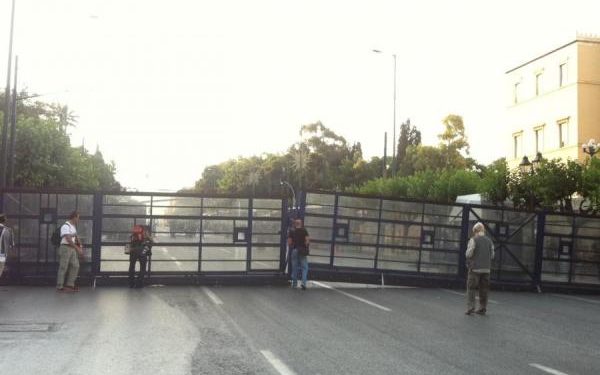 στο ύψος των ανθοπωλείων. Ενας τοίχος από σίδερο και πλέξιγκλας κόβει τον δρόμο στα δυο και κάνει την Βουλή απροσπέλαστη.