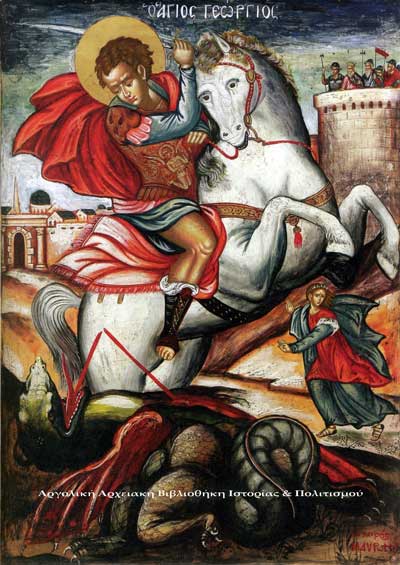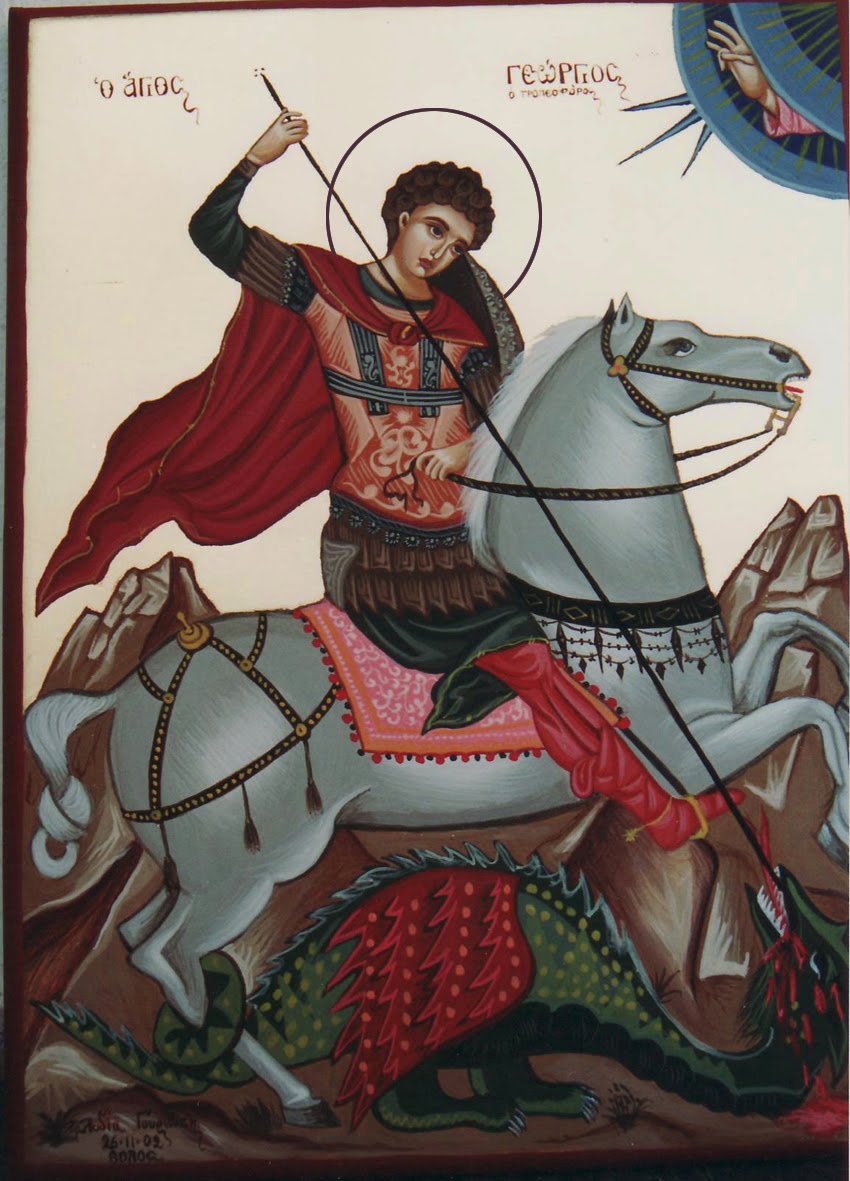 “[Μετά τη λατινική και τουρκική κατάκτηση οι Έλληνες] χρειάζονταν πάνω από όλα προστασία από τους κατακτητές. Η προστατευτική λειτουργία των στρατιωτικών αγίων έγινε πάλι επίκαιρη. Παρουσιάζονται σε αμέτρητες αναπαραστάσεις, κυρίως στις προσόψεις ή στις εισόδους των ναών. Αυτές οι εικόνες ήταν απλά πορτραίτα αλλά ένας δημοφιλής εικονογραφικός τύπος ήταν αυτός του Αγίου Γεωργίου που σκοτώνει έναν εχθρό ή ένα αντιπαθητικό τέρας. Αυτό χρησίμευε ως ένας γλωσσικός κώδικας: στη θέση του τέρατος εννοούνταν οι Τούρκοι.”