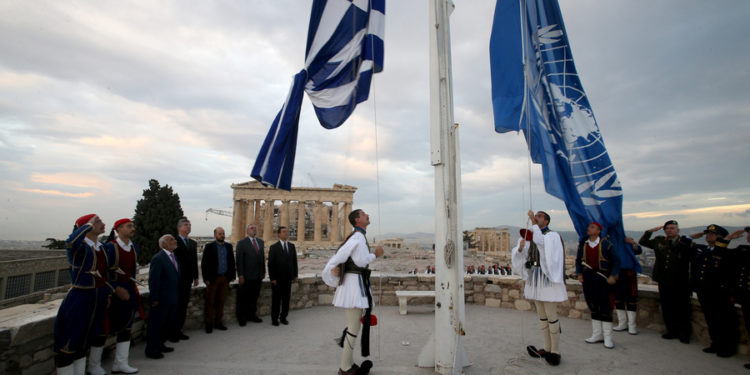 Έπαρση της σημαίας του Οργανισμού Ηνωμένων Εθνών, μαζί με την ελληνική σημαία, πραγματοποιήθηκε το πρωί της Δευτέρας στον ιερό βράχο της Ακρόπολης, με την ευκαιρία του σημερινού εορτασμού της Ημέρας του ΟΗΕ.
