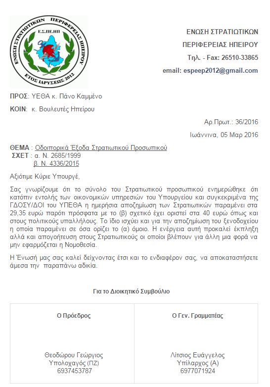 Το θέμα εντόπισε η Ένωση Στρατιωτικών Περιφέρειας Ηπείρου, η οποία έκανε επιστολή στον υπουργό Εθνικής Άμυνας, ζητώντας του να αποκαταστήσει αυτή την αδικία. » Η ενέργεια αυτή προκαλεί έκπληξη αλλά και απογοήτευση στους Στρατιωτικούς οι οποίοι βλέπουν για άλλη μια φορά να μην εφαρμόζεται η Νομοθεσία», αναφέρει χαρακτηριστικά η επιστολή.