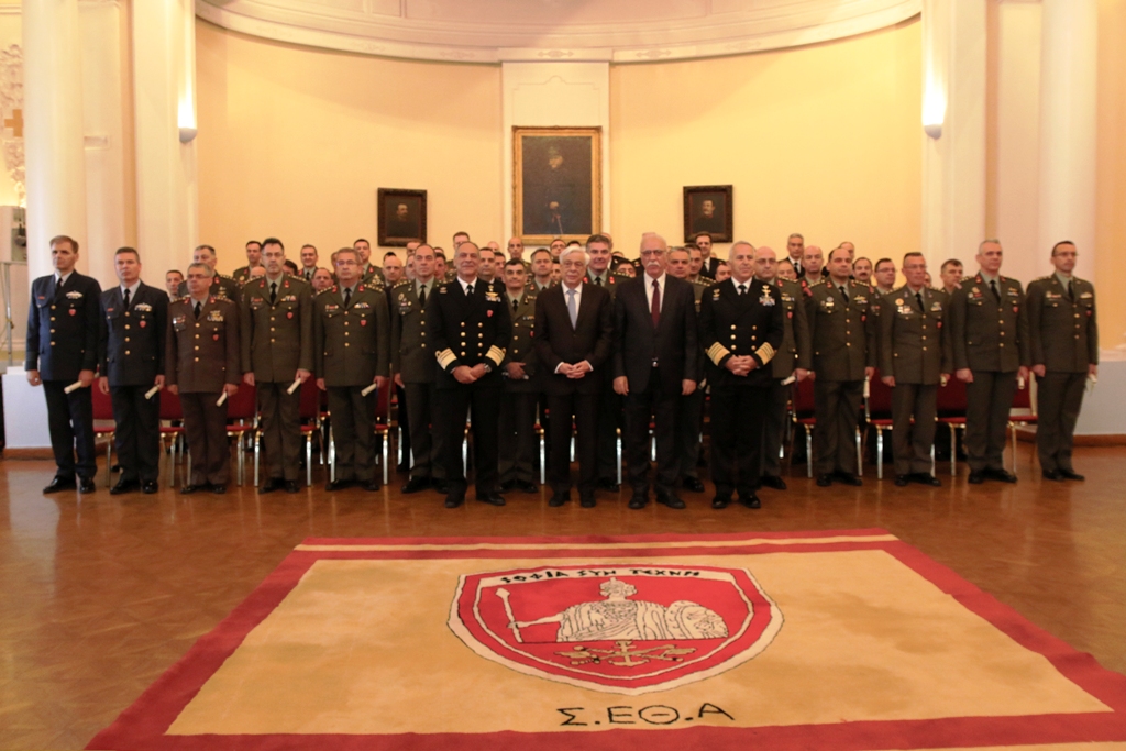 Ο Πρόεδρος της Δημοκρατίας Προκόπιος Παυλόπουλος, παρουσία του Αναπληρωτή Υπουργού Εθνικής Άμυνας Δημήτρη Βίτσα, του Αρχηγού ΓΕΕΘΑ Ναυάρχου Ευάγγελου Αποστολάκη ΠΝ, του Αρχηγού ΓΕΣ Αντιστράτηγου Αλκιβιάδη Στεφανή και του Αρχηγού ΕΛ.ΑΣ. Αντιστράτηγου Κωνσταντίνου Τσουβάλα, καθώς και εκπροσώπων της Βουλής των Ελλήνων και πολιτικών κομμάτων, απένειμε σήμερα τα πτυχία στους αποφοίτους σπουδαστές της 69ης Εκπαιδευτικής Σειράς της Σχολής Εθνικής Άμυνας (ΣΕΘΑ), σε τελετή που πραγματοποιήθηκε στη Λέσχη Αξιωματικών Ενόπλων Δυνάμεων (ΛΑΕΔ).