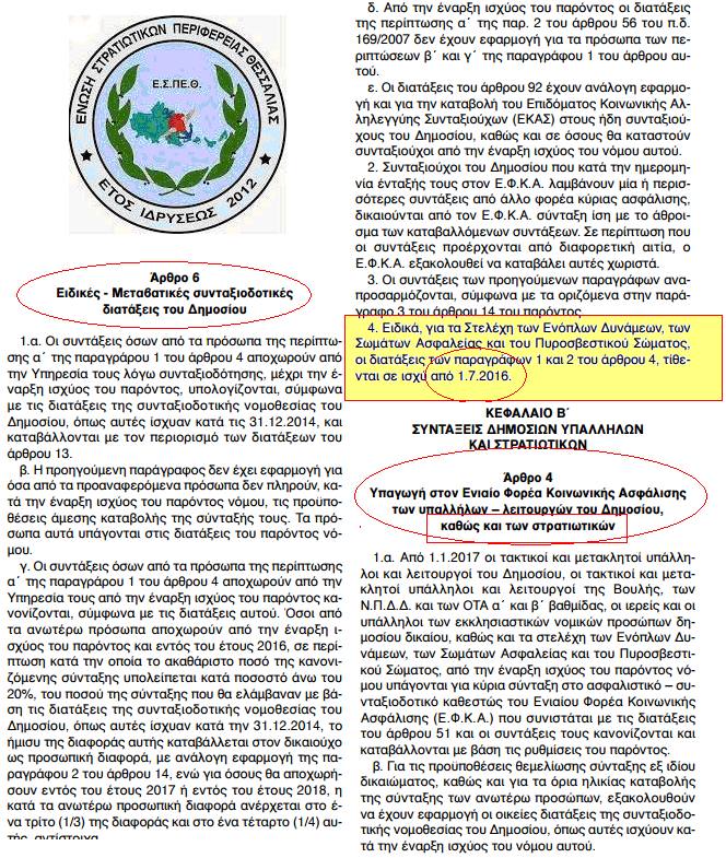 Όπως παρατηρεί ο Ηλίας Νατσιούλας, λοχαγός ε.α. και πρώην πρόεδρος της Ένωσης Στρατιωτικών Περιφέρειας Θεσσαλίας, στη σελίδα του στο Facebook, «αν και υπήρχε η αίσθηση ότι θα καθυστερήσει το ειδικό μισθολόγιο και έτσι οι στρατιωτικοί θα γλιτώσουν τις επώδυνες διατάξεις του ασφαλιστικού, τελικά στο ψηφισθέν Νομοσχέδιο απαλείφτηκε η φράση «τίθεται σε ισχύ μετά την έναρξη εφαρμογής του νέου ειδικού μισθολογίου για τα στελέχη αυτά και κατόπιν έκδοσης ειδικού εφαρμοστικού Νόμου» και μπήκε η φράση τίθενται σε ισχύ από 1.7.2016.