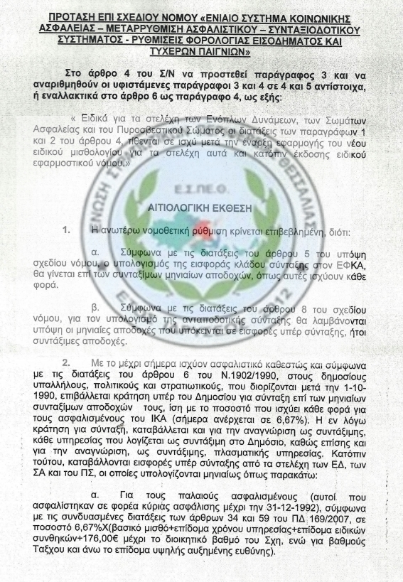Ο συλλογισμός ενισχύεται περισσότερο από το γεγονός ότι η τροπολογία στην αρχική της μορφή, όπως την είχε συντάξει η ΓΔΟΣΥ του ΥΠΕΘΑ και είχε δώσει στη δημοσιότητα η Ένωση Στρατιωτικών Περιφέρειας Θεσσαλίας, όριζε ότι «Ειδικά για τα μέλη των Ενόπλων Δυνάμεων, των Σωμάτων Ασφαλείας και του Πυροσβεστικού Σώματος οι διατάξεις των παραγράφων 1 και 2 του άρθρου 4, τίθενται σε ισχύ μετά την έναρξη εφαρμογής του νέου ειδικού μισθολογίου για τα στελέχη αυτά και κατόπιν έκδοσης ειδικού εφαρμοστικού νόμου».