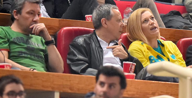 Τετ α τετ δεν το λες γιατί η συνάντηση Τάκη Μπαλτάκου και Ραχήλ Μακρή έγινε στο κατάμεστο ΟΑΚΑ στον αγώνα μπάσκετ ΠΑΟ-Μπαρτσελόνα.