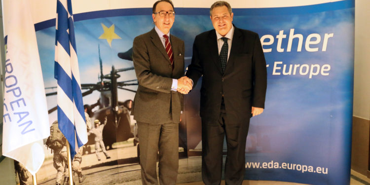 Ο Υπουργός Εθνικής Άμυνας Πάνος Καμμένος, συνοδευόμενος από εκπροσώπους της Ελληνικής Αμυντικής Βιομηχανίας, επισκέφτηκε τον Ευρωπαϊκό Οργανισμό Άμυνας (ΕΟΑ) όπου συζήτησε με τον Εκτελεστικό Διευθυντή Jorge Domecq τις δυνατότητες ενισχύσεως της συνεργασίας της χώρας μας με τον Οργανισμό.