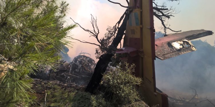 Το αεροσκάφος, που κατέπεσε ενώ συμμετείχε στην επιχείρηση κατάσβεσης της μεγάλης φωτιάς που ξέσπασε, αργά το βράδυ του Σαββάτου (25.06.2016) στα Δερβενοχώρια, έχει καταστραφεί και το πρώτο πράγμα που έρχεται στο μυαλό όταν κανείς βλέπει τις φωτογραφίες είναι «πως βγήκαν ζωντανοί οι πιλότοι».