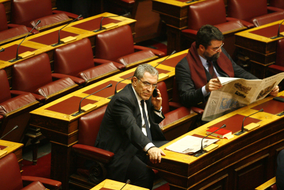 Η φωτογραφία είναι ενδεικτική του κλίματος της πρώτης ψηφοφορίας στην Βουλή για Πρόεδρο της Δημοκρατίας. Καπερνάρος και Οικονόμου δύο από τους βουλευτές που το όνομά τους είχε συζητηθεί δείχνουν πολύ χαλαροί,λίγο πριν από την ψηφοφορία.