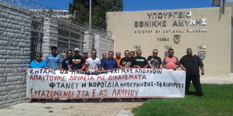 Οι απολυμένοι έκαναν παράσταση διαμαρτυρίας το πρωί της Τετάρτης έξω από το υπουργείο Εθνικής Άμυνας, ζητώντας την επαναπρόσληψή τους.