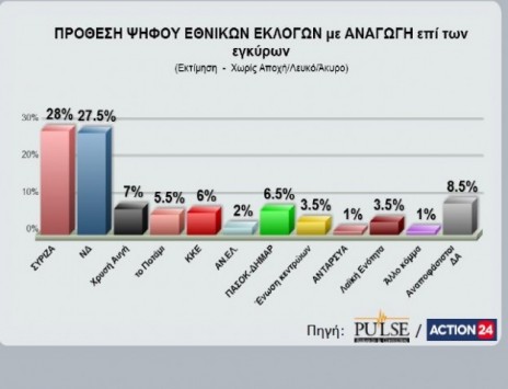Στη δημοσκόπηση ης εταιρείας Pulse για το Action24 ο ΣΥΡΙΖΑ εξακολουθεί και έχει οριακό προβάδισμα κατά 0,5% έναντι της Νέας Δημοκρατίας στην πρόθεση ψήφου, ενώ θρίλερ φαίνεται πως θα έχουμε και για την τρίτη θέση.