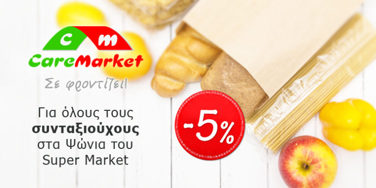 Το CareMarket στηρίζει έμπρακτα τους συνταξιούχους προσφέροντας για τις αγορές τους -5% έκπτωση. Σε μια περίοδο ιδιαίτερα δύσκολη, η οικονομική αυτή προσφορά διατίθεται σε νέους και υφιστάμενους πελάτες του ηλεκτρονικού μας Super Market.