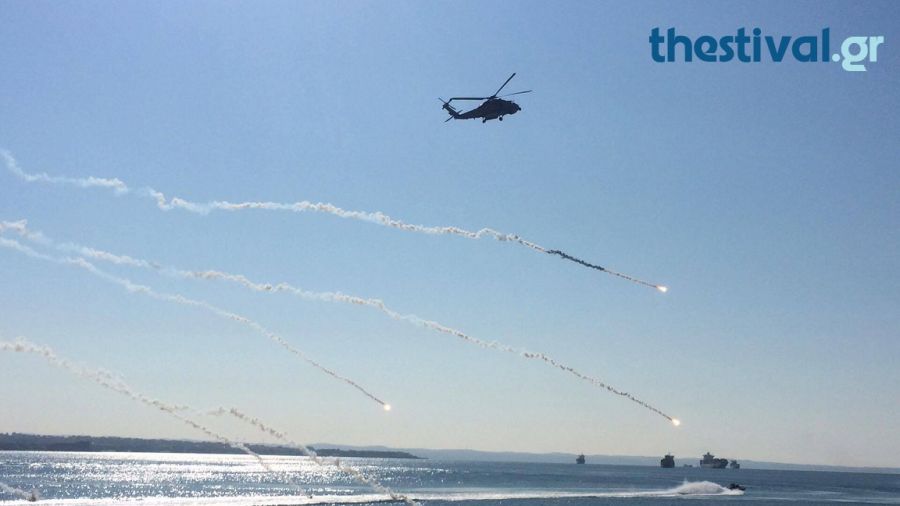 H επίδειξη ολοκληρώθηκε μετά από περίπου 20 λεπτά, με χαμηλή πτήση ελικοπτέρου Σινούκ, πάνω από την παλιά παραλία της Θεσσαλονίκης.