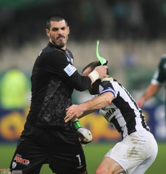 Εκτός εαυτού ο τερματοφύλακας του ΠΑΟΚ μετά το πέναλτι που κέρδισε ο Παναθηναϊκός, έκανε χειρονομίες, κλωτσούσε τις πινακίδες και μετά την αποβολή του προσπάθησε να επιτεθεί στον επόπτη με τους συμπαίκτες του να τον συγκρατούν.