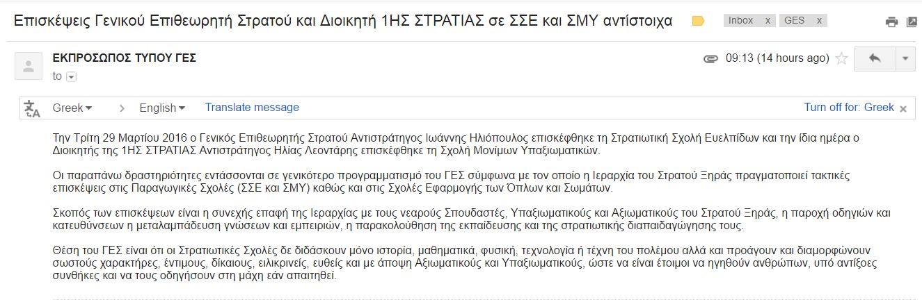 Χθες όμως εντοπίσαμε ότι κάτι «ξέφυγε». Δημοσιεύτηκαν δυο επίσημες ανακοινώσεις σχετικές με επισκέψεις «noname» στρατηγών σε κάποιες μονάδες, αλλά ταυτόχρονα στάλθηκε και ενημερωτικό e-mail με αυτές τις επισκέψεις και περιείχε ονόματα!