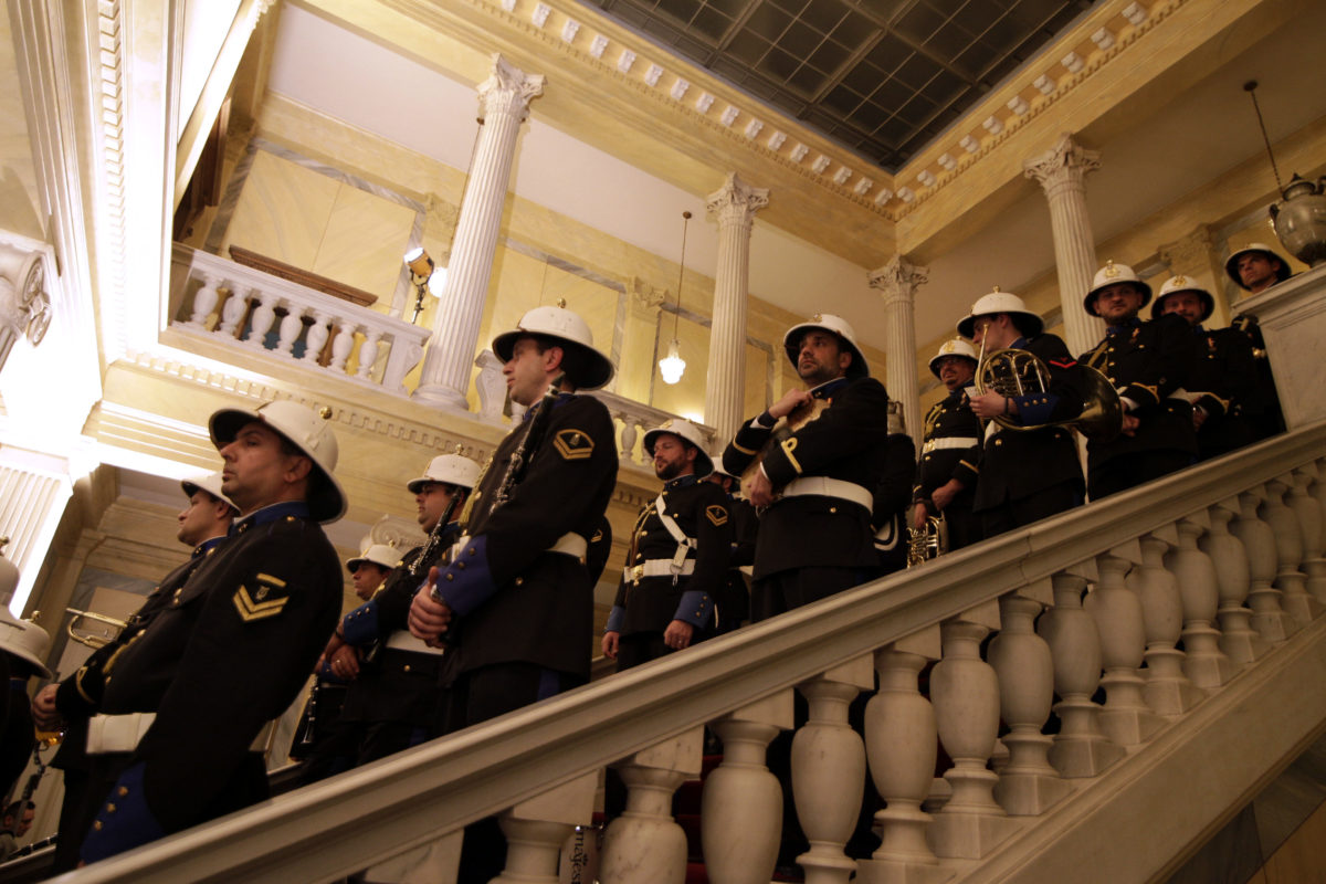 Η μπάντα του ΠΝ “ξεπροβόδισε” τον Κάρολο Παπούλια ,μετά από 10 χρόνια στην Προεδρία της Δημοκρατίας. Και αυτή υποδέχτηκε τον νέο Πρόεδο της Δημοκρατίας Προκόπη Παυλοπουλο ο οποίος λίγο νωρίτερα είχε ορκιστεί στη Βουλή.
