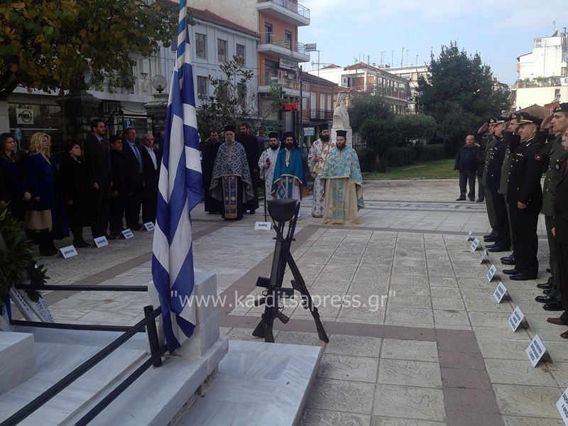 Κατόπιν έγινε επιμνημόσυνη δέηση στον προ του ηρώου πεσόντων χώρο και κατάθεση στεφάνων από τον κ. Αντιπεριφερειάρχη, τον Α.Δ. Φρουράς Καρδίτσας, την αντιδήμαρχο Καρδίτσας, τον Αστυνομικό Δ/ντή, το Διοικητή Πυροσβεστικής Υπηρεσίας, Εφεδροπολεμιστικές Οργανώσεις, Εκπροσώπους Αναπηρικών Οργανώσεων, Εκπροσώπους Αγωνιστών Εθνικής Αντίστασης, Πολιτικών Κομμάτων, Πολιτικές Νεολαίες και εκπροσώπους νομικών προσώπων.