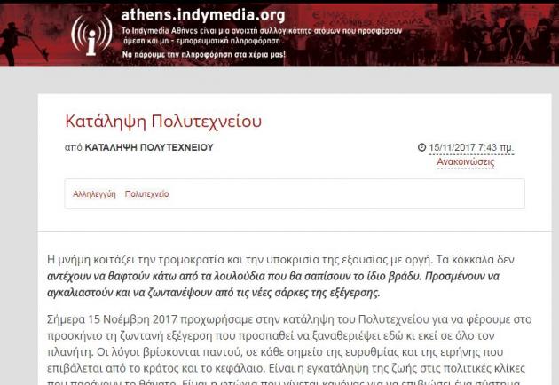 Την κατάληψη του Πολυτεχνείου ανακοίνωσαν πριν από λίγο, μέσω του indimedia , ομάδα αντιεξουσιαστών των Εξαρχείων.