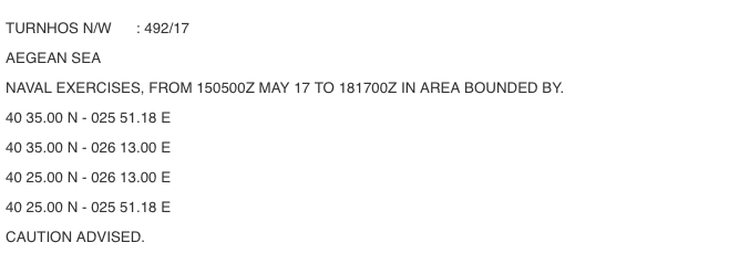 Αξίζει να αναφέρουμε οτι απο σήμερα 15 Μαΐου ξεκινά και σε περιοχή του Κεντρικού Αιγαίου η τουρκική άσκηση Ναυτικής Συνεργασίας και Κατεύθυνσης Πλοίων (NCAGS) DENİZ KURDU-2017.