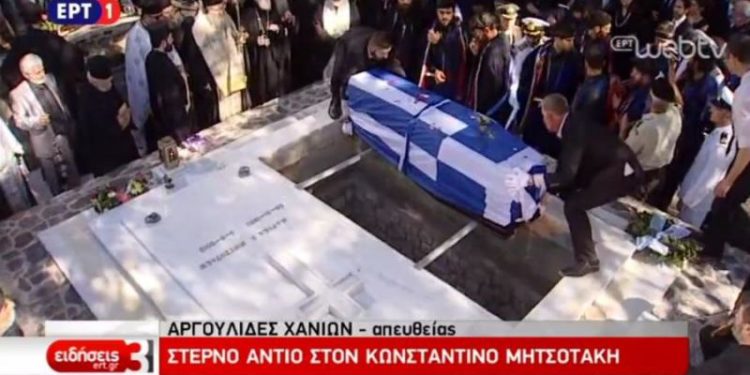 Με παραδοσιακά ριζίτικα τραγούδια και μαντινάδες συνοδεία κρητικής λύρας κατευόδωσαν τον πρώην πρωθυπουργό Κωνσταντίνο Μητσοτάκη οι συντοπίτες του που πλημμύρισαν το κοιμητήριο του Αργουλιδέ Χανίων. Και πριν αποδώσει τιμές το στρατιωτικό άγημα, αντήχησε ο τόπος από τις μπαλωθιές, όπως αποχαιρετούν κάποιον πολύ δικό τους οι Κρήτες…
