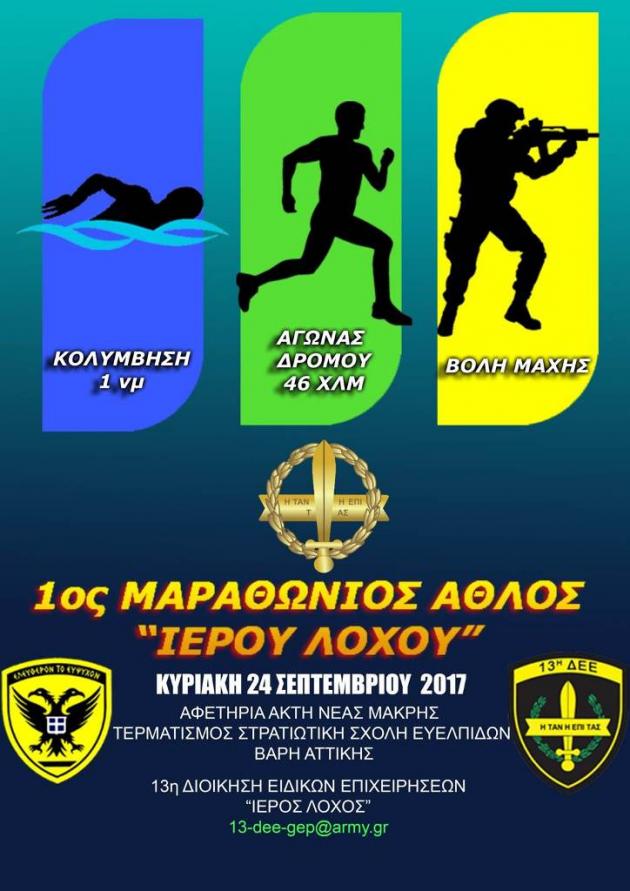 Στο πλαίσιο του εορτασμού των 75 χρόνων από την ίδρυση του «ΙΕΡΟΥ ΛΟΧΟΥ», θα πραγματοποιηθεί στρατιωτικός αγώνας με την ονομασία 1ος ΜΑΡΑΘΩΝΙΟΣ ΑΘΛΟΣ «ΙΕΡΟΥ ΛΟΧΟΥ», με σημείο έναρξης την παραλία της Νέας Μάκρης και τερματισμό τις εγκαταστάσεις της Στρατιωτικής Σχολής Ευελπίδων(ΣΣΕ) στην Βάρη της Αττικής.
