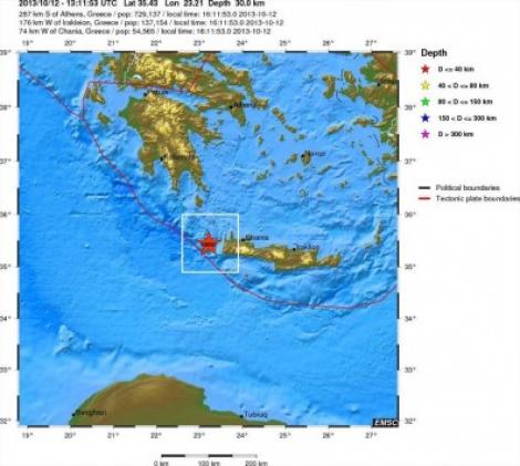 Το επίκεντρο του σεισμού ήταν 64 χλμ δυτικά του νομού Χανίων και είχε εστιακό βάθος 51 χιλιόμετρα στο θαλάσσιο χώρο.