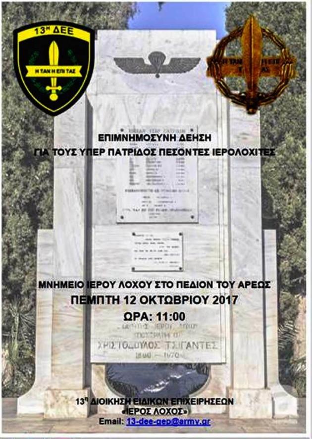Την Πέμπτη 12 Οκτωβρίου 2017 και ώρα 11:00, θα τελεστεί επιμνημόσυνη δέηση για τους Υπέρ Πατρίδος Πεσόντες Ιερολοχίτες, στο Μνημείο Ιερού Λόχου στο Πεδίον του Άρεως.