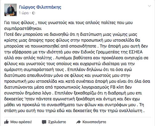 Ποτέ δεν μπορούσα να διανοηθώ ότι η διατύπωση μιας γνώμης μιας κρίσης μιας άποψης προς φίλους στην προσωπική μου ιστοσελίδα θα μπορούσε να ποινικοποιηθεί από οποιονδήποτε. Την άποψή μου αυτή δεν την εξέφρασα με την ιδιότητά μου σαν Ειδικός Γραμματέας της ΕΣΗΕΑ αλλά σαν απλός πολίτης. Λυπάμαι βαθύτατα εαν προκάλεσα ανησυχία σε φίλους και γνωστούς τους οποίους και ευχαριστώ ιδιαίτερα για την αμέριστη συμπαράστασή τους. Επιπλέον δηλώνω ότι τα όσα εγώ διατύπωσα απευθυνόταν μόνο σε φίλους και γνωστούς μου στην προσωπική μου ιστοσελίδα και κατά συνέπεια άποψή μου είναι ότι όλα όσα διατυπώνονται μέσα από προσωπικούς λογαριασμούς FB κλπ δεν συνιστούν δημόσιο λόγο. Επιπλέον ξεκαθαρίζω ότι η διαδρομή μου επι δεκαετίες ‘ηταν πάντοτε αγωνιστική ξεκάθαρη και έντιμη και δεν εχω μάθει να προκαλώ τα συναισθήματα των φίλων και συντρόφων μου. Τη στάση μου αυτή που τηρώ εδώ και δεκαετίες θα την τηρώ αναλλοίωτη».