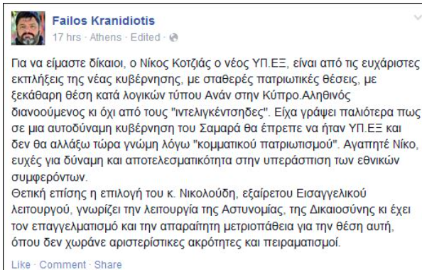 Απέδειξε ακόμη μία φορά ότι λέει αυτό που πιστεύει με μια ανάρτησή του στην σελίδα του στο facebook. Στην οποία λέει ένα καθαρό ναι κι ένα μπράβο για την επιλογή του Νίκου Κοτζιά για την θέση του ΥΠΕΞ.