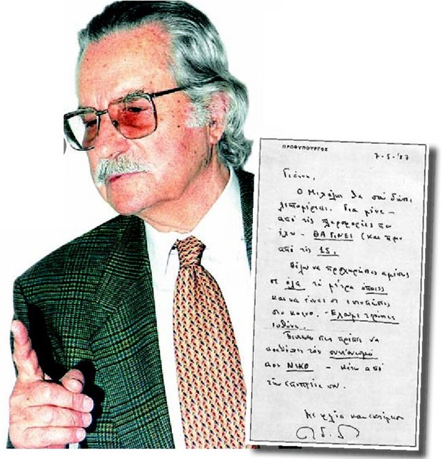 «Γιάννη, ο Μιχάλης (σ.σ.: εννοούσε τον έµπιστο συνεργάτη του Μιχάλη Ζιάγκα) θα σου δώσει λεπτοµέρειες. Για µένα, από τις πληροφορίες που έχω, ΘΑ ΓΙΝΕΙ (και πριν από τις 15). Θέλω να προχω ρήσεις αµέσως σε όλα τα µέτρα, όποιες και αν είναι οι εντυπώσεις στο κοινό. Εχουµε τεράστια ευθύνη. Πιστεύω ότι πρέπει να αναθέσεις τον συντονισµό στον ΝΙΚΟ (σ.σ.: εννοούσε τον Α/ΓΕΕΘΑ Νίκο Κουρή), κάτω από την εποπτεία σου».