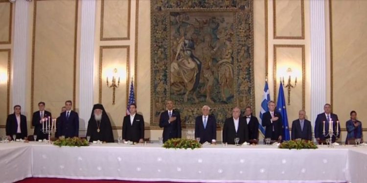 Ιδιαίτερα συγκινημένος εμφανίστηκε ο Πρόεδρος της Δημοκρατίας, Προκόπης Παυλόπουλος κατά τη διάρκεια της προσφώνησης του Μπάρακ Ομπάμα, πριν το επίσημο δείπνο που παρατίθεται στο Προεδρικό Μέγαρο προς τιμήν του υψηλού προσκεκλημένου.