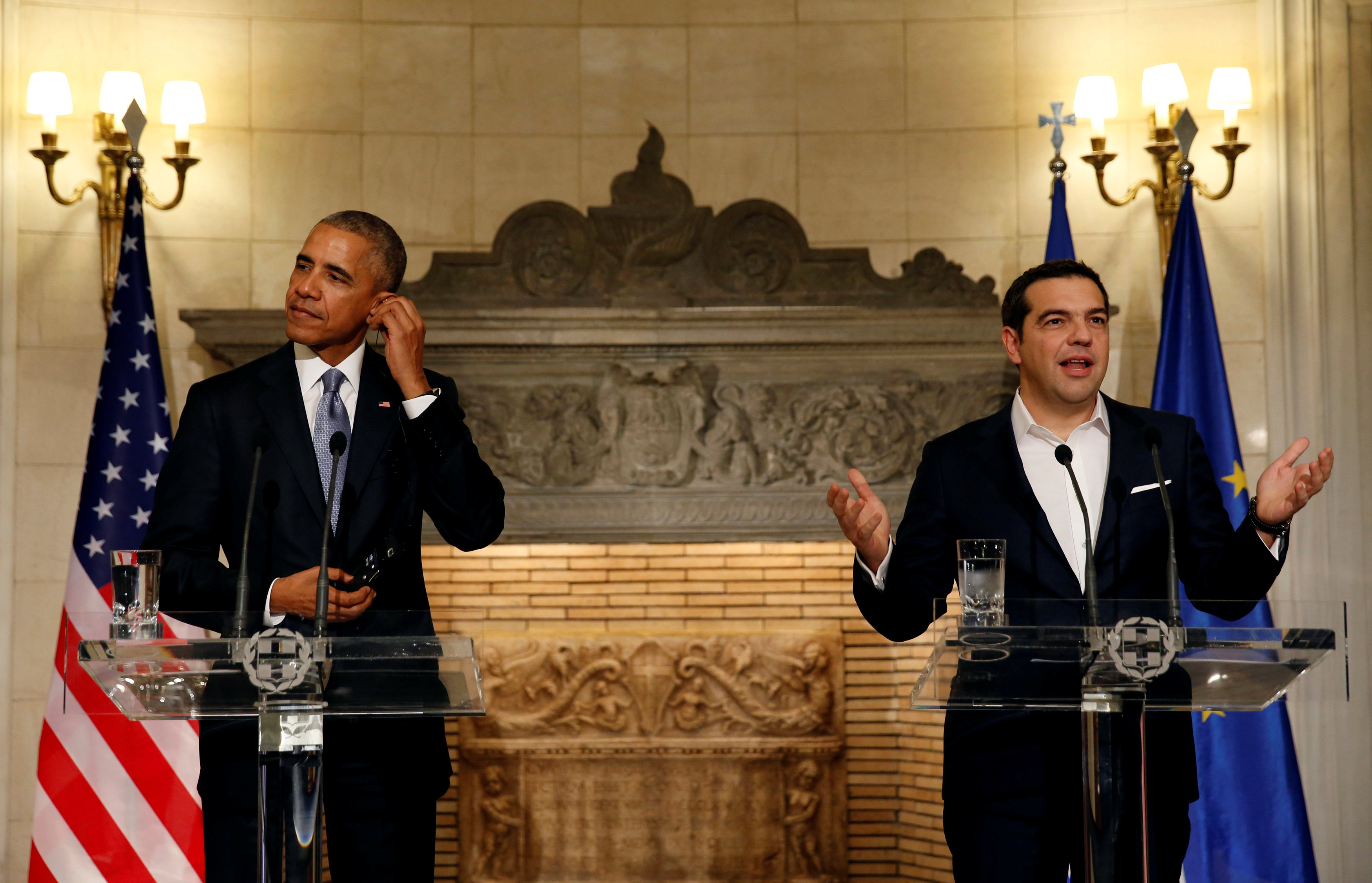 Ο Πρωθυπουργός, Αλέξης Τσίπρας, ευχαρίστησε στις κοινές τους δηλώσεις τον αμερικανό Πρόεδρο, Μπαράκ Ομπάμα, με τον τελευταίο να ανταποδίδει σχετικά με την αντιμετώπιση από τη χώρα μας του ζητήματος του προσφυγικού, το οποίο ο Αλέξης Τσίπρας χαρακτήρισε στην αρχή μία από τις τρεις παράλληλες κρίσεις τις οποίες αντιμετωπίζουμε, μαζί με την οικονομική και την κρίση ασφάλειας.