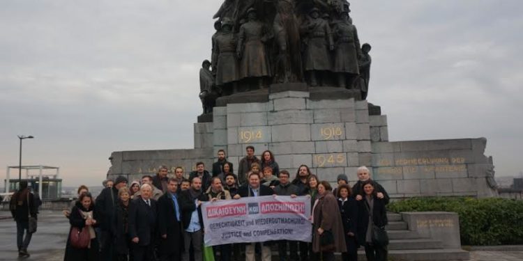 Η αντιπροσωπεία άνοιξε πανό με το σύνθημα »Δικαιοσύνη και Αποζημίωση» σε τρεις γλώσσες – το ίδιο έγινε και στην έδρα του Ευρωκοινοβουλίου, μπροστά σε όλες τις σημαίες, μαζί με τον Μανώλη Γλέζο.