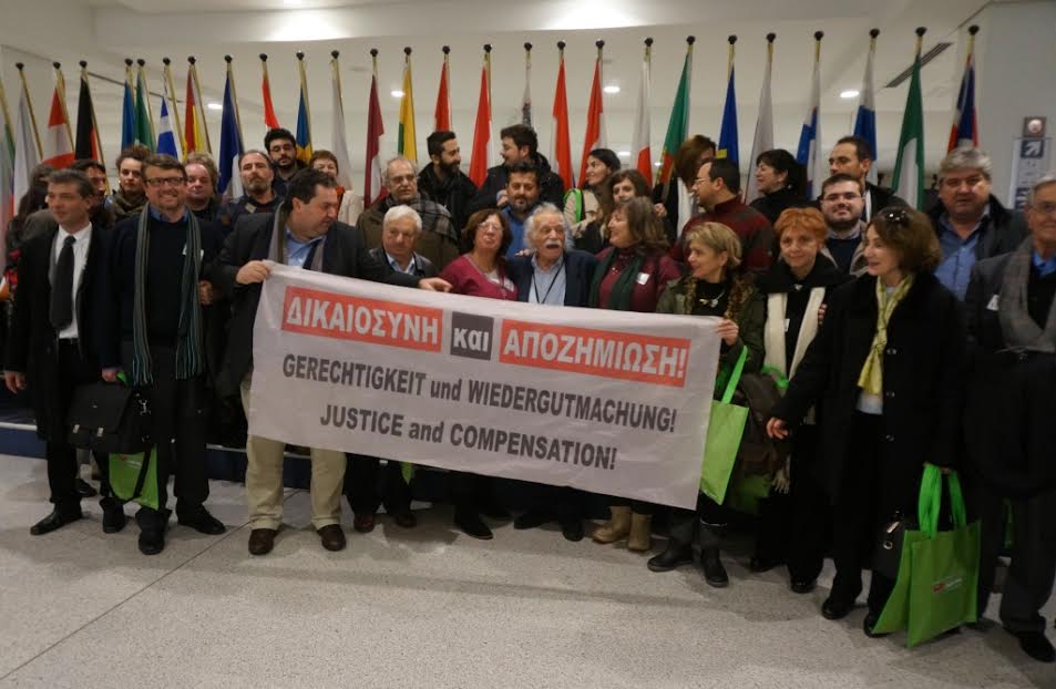 Η αντιπροσωπεία άνοιξε πανό με το σύνθημα »Δικαιοσύνη και Αποζημίωση» σε τρεις γλώσσες – το ίδιο έγινε και στην έδρα του Ευρωκοινοβουλίου, μπροστά σε όλες τις σημαίες, μαζί με τον Μανώλη Γλέζο.