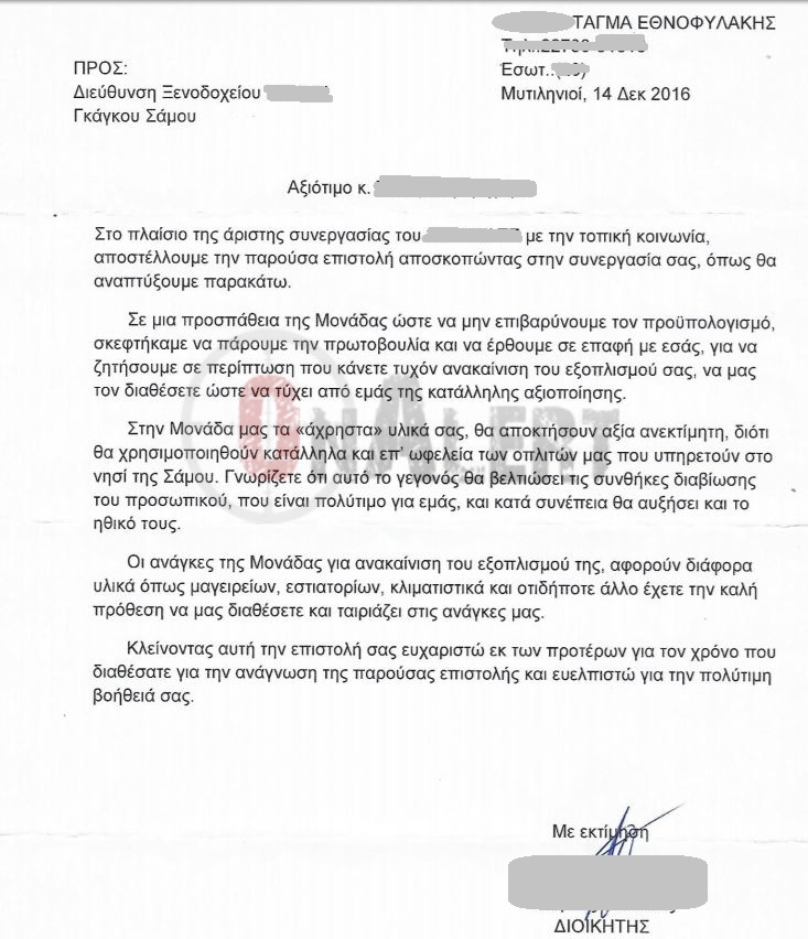 Μια επιστολή διοικητή Μονάδας στη Σάμο, προς ξενοδόχο της περιοχής έκανε το γύρο του διαδικτύου.