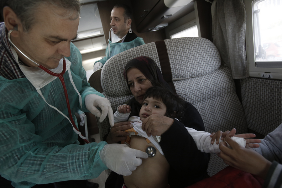 Μικρά παιδιά, γυναίκες, κάποιες υποβασταζόμενες, και άνδρες δέχονται τη βοήθεια των 20 γιατρών που η διοίκηση του «Υγεία» έστειλε προκειμένου να διαπιστώσουν αν υπάρχουν προβλήματα υγείας, να βοηθήσουν όσους έχουν κάποιο πρόβλημα, να δώσουν φάρμακα σε όσους δεν παίρνουν την αγωγή τους και να νοσηλευτούν αν χρειαστεί, δωρεάν, στα νοσοκομεία του ομίλου.